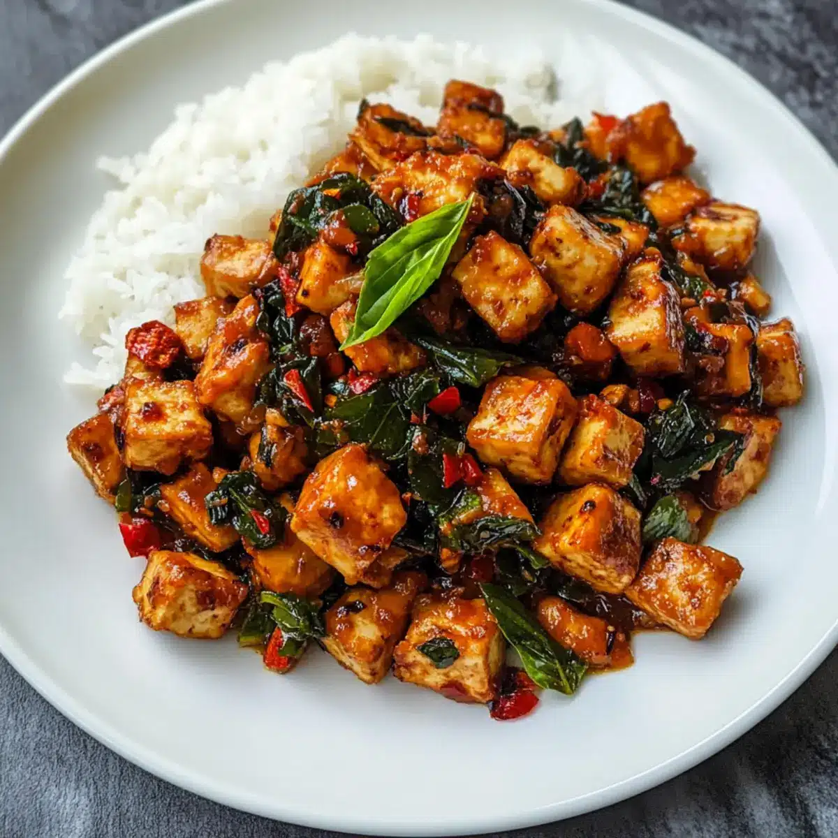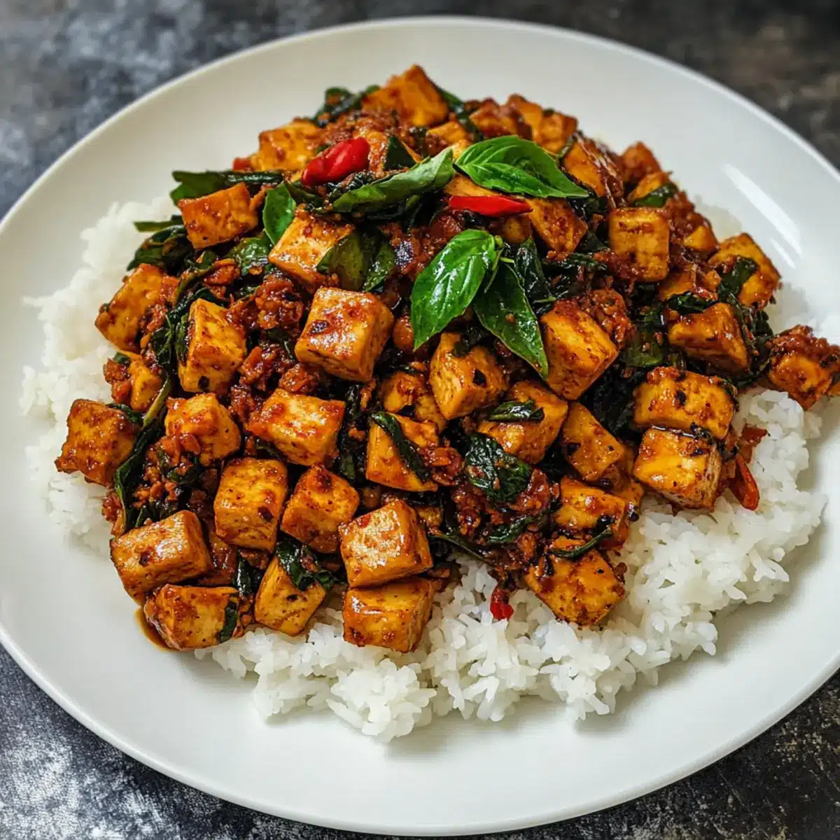 Die lebendige Farbenpracht und der verführerische Duft von Thai-Basilikum-Tofu (Tofu Pad Krapow) haben mich sofort in ihren Bann gezogen. Diese einfache, aber köstliche Rezeptur kombiniert aromatische Noten von frischem Thai-Basilikum und Chili, die gleichsam herausfordernd und einladend sind. Was ich besonders schätze, ist die Vielseitigkeit: Man kann den Tofu nach Lust und Laune backen oder braten, und dabei unterschiedliche Schärfegrade einstellen – ganz nach meinem Geschmack! Diese proteinreiche, vegetarische Mahlzeit ist nicht nur schnell zubereitet, sie ist auch perfekt für Menschen, die gesunde und nährstoffreiche Gerichte lieben, ohne auf den gewohnten Genuss verzichten zu müssen. Es ist wirklich der ideale Begleiter für einen gemütlichen Abend, besonders wenn man ihn mit einem Löffel dampfendem Reis kombiniert. Neugierig, auf welche köstlichen Variationen Sie zurückgreifen können?