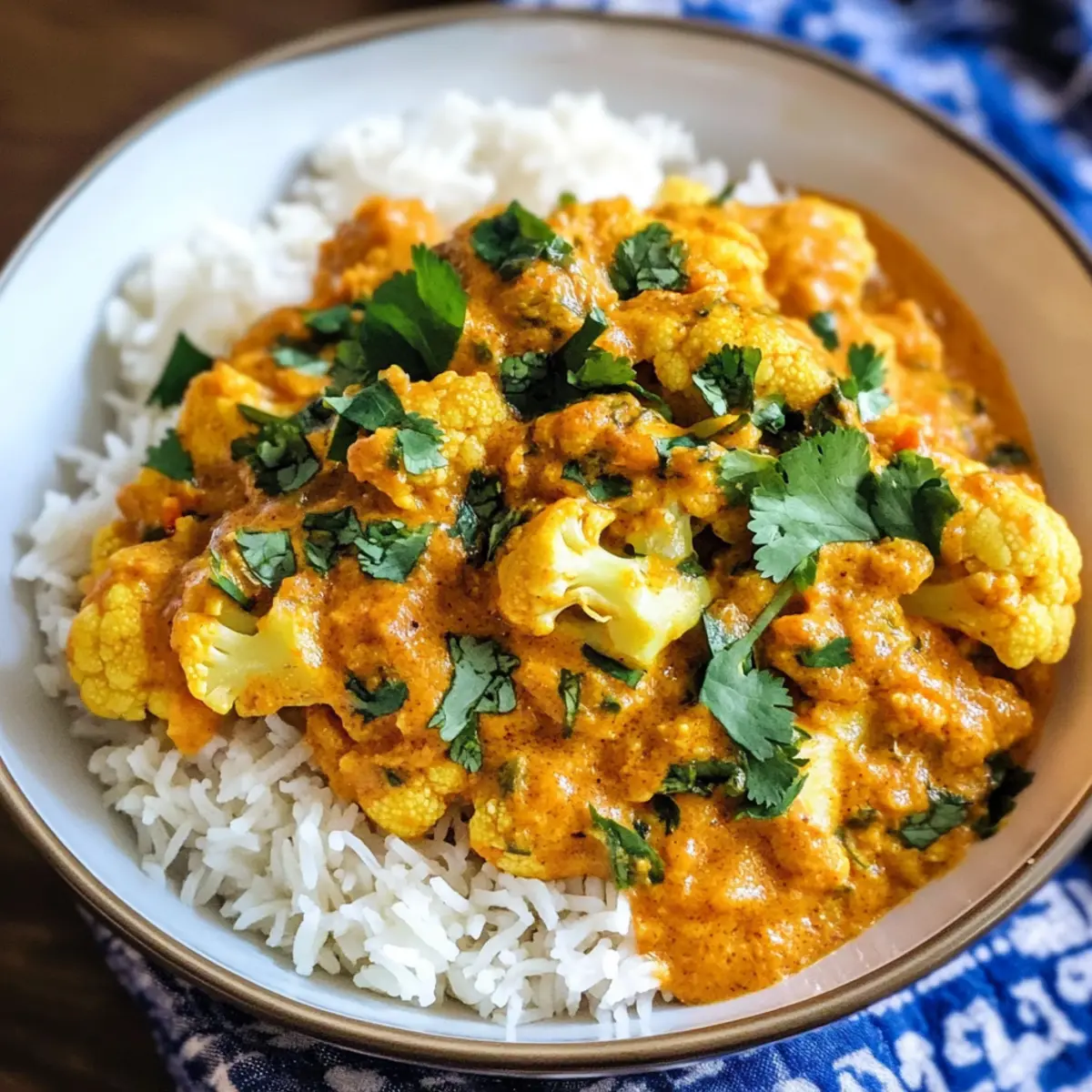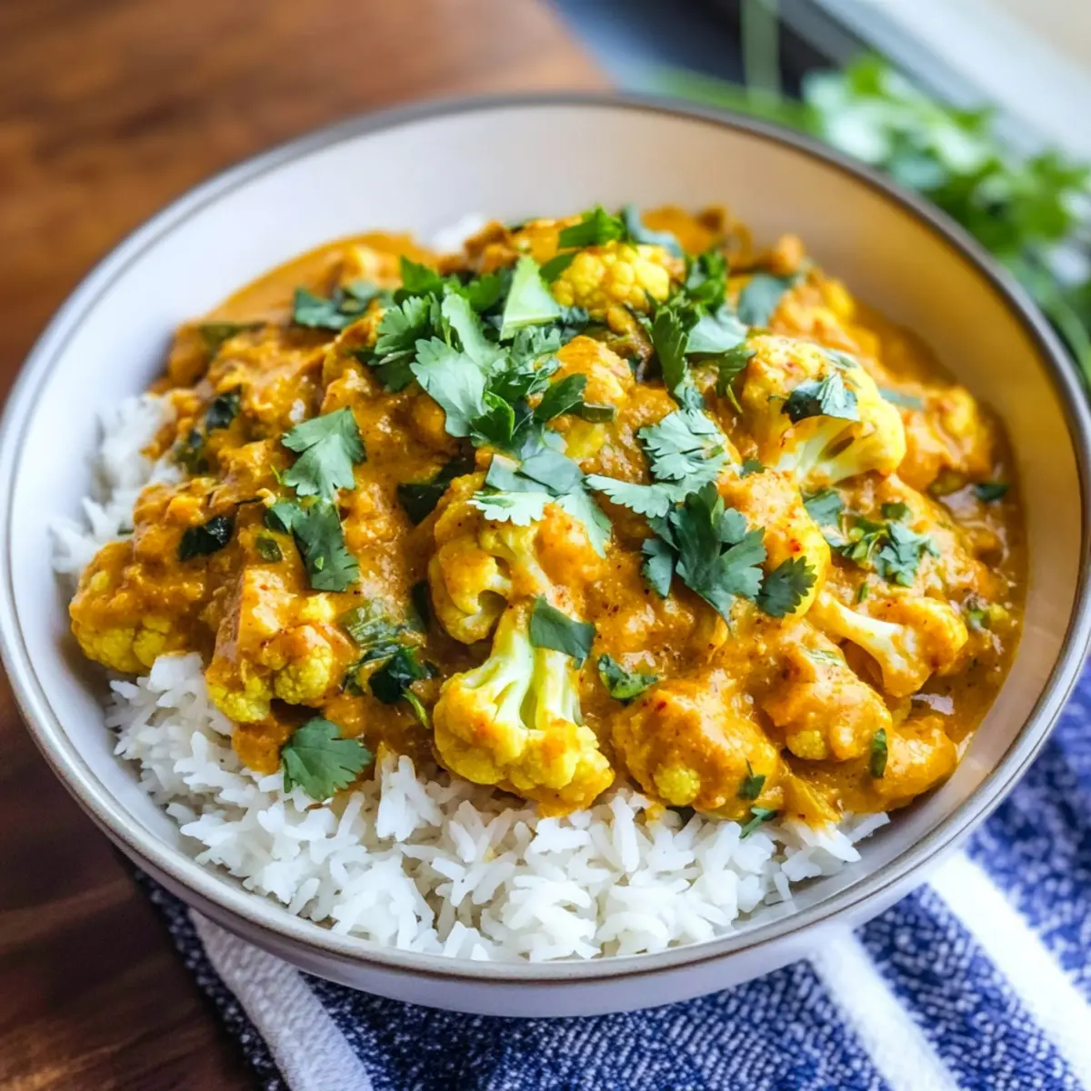 Serviere das kokossüße Blumenkohl Curry warm in Schalen, garniert mit frisch gehacktem Koriander, wenn gewünscht. Das Gericht passt hervorragend zu Basmati-Reis oder warmem Naan-Brot, was die perfekte Ergänzung zu diesem herzhaften Genuss darstellt.