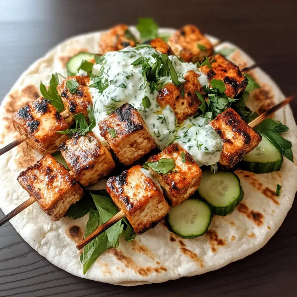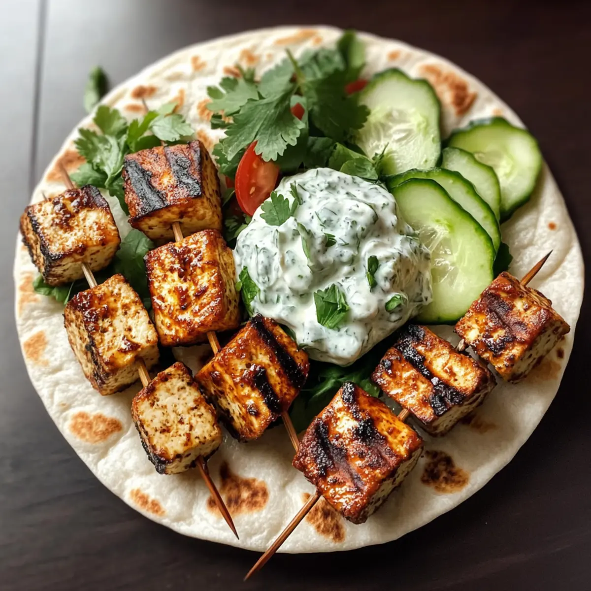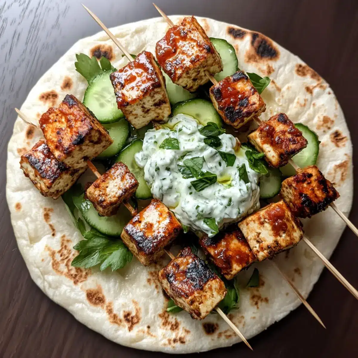 Veganer Tofu Souvlaki mit cremigem Tzatziki