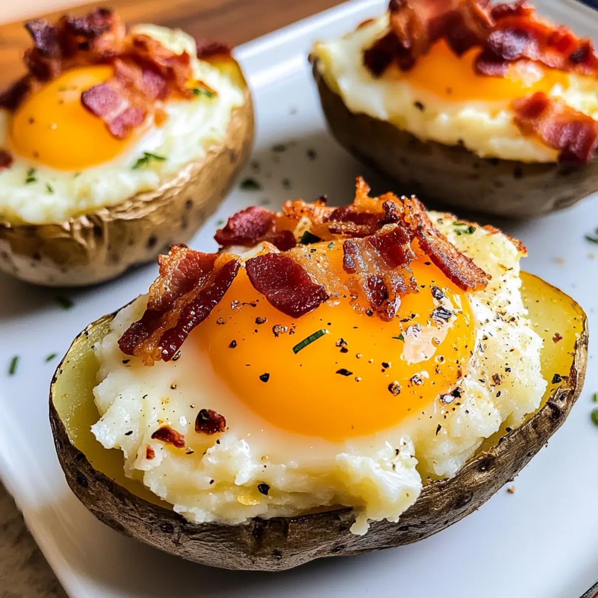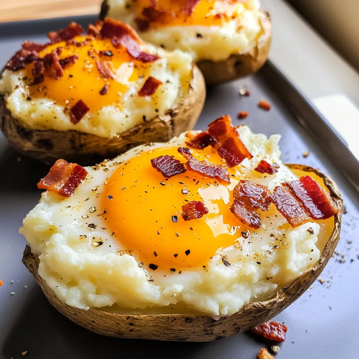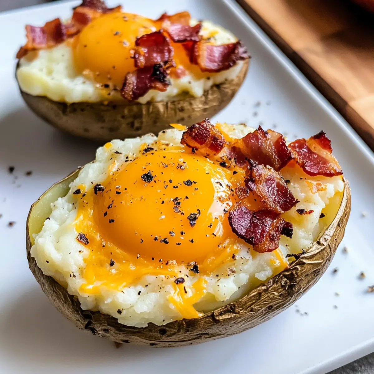 Schlage je ein großes Ei vorsichtig in die Mulde der gefüllten Kartoffeln. Würze die Eierschalen ebenfalls mit Salz und Pfeffer, um zusätzlichen Geschmack zu verleihen. Senke die Ofentemperatur auf 190°C und backe die Kartoffeln für 15 bis 20 Minuten, bis das Eiweiß fest ist, während das Eigelb schön weich bleibt.